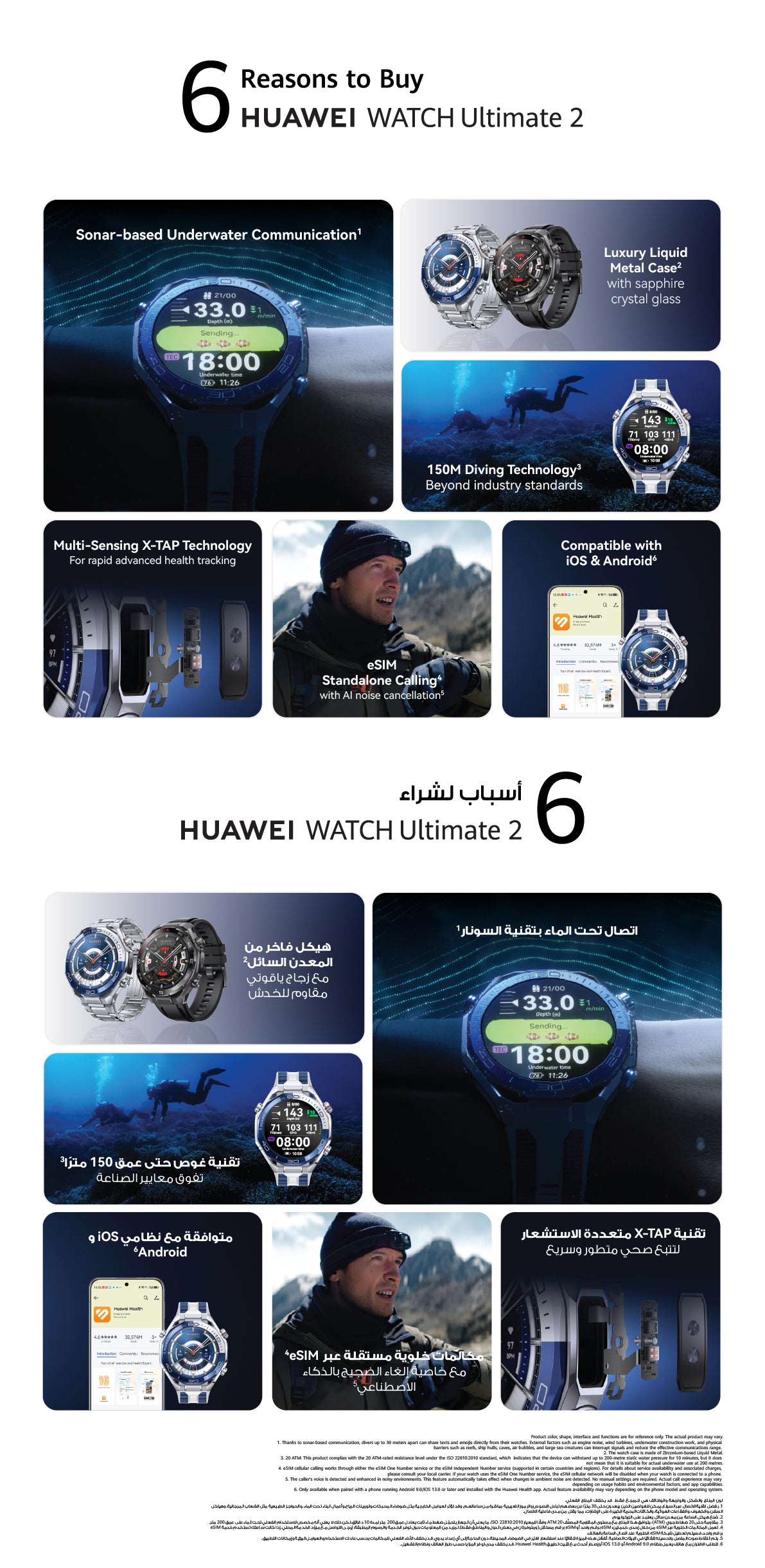 Advanced and premium material | Unique underwater communications technology | eSIM cellular calling supported by dual battery modes | AI noise cancellation.